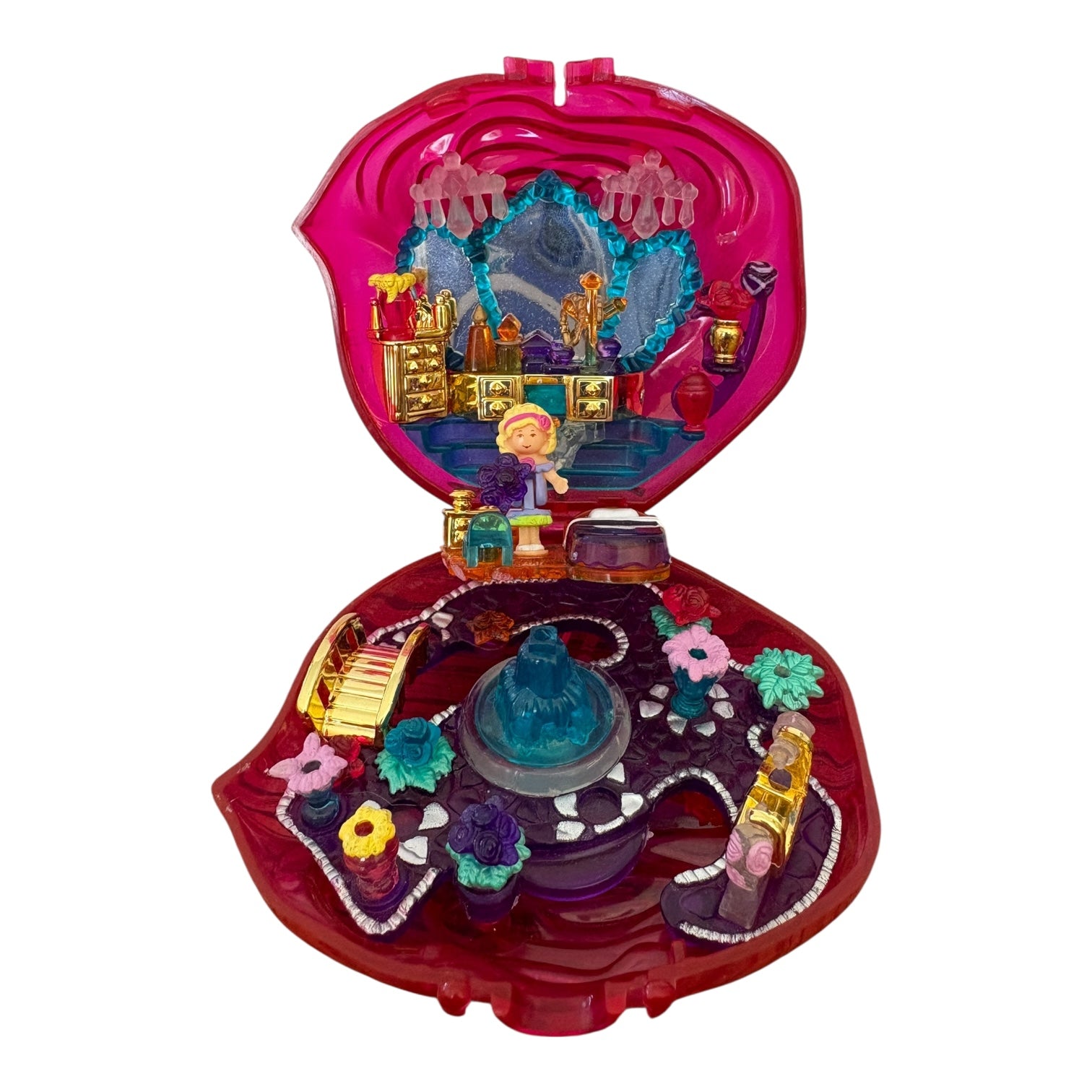 Rose bottle-shaped compact with a vanity and garden. Features a swinging garden glider, spinning fountain, and fold-up bed. Comes with Polly and crystal flower accessories.
